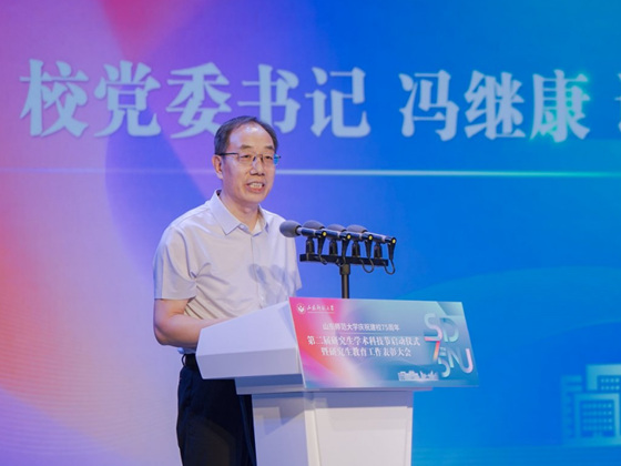 冯继康在讲话中充分肯定了学校在学术研究、创新创业领域取得的成果。他指出,面对新时代研究生教育的新要求和新挑战,要凝聚发展共识,激励创新突破,全方位助力同学们在创新征程上勇攀高峰、在成才道路上行稳致远。他强调,要塑造立德树人新格局,加快构建“大思政”工作体系,深化落实导师立德树人职责,营造“师生共进、教学相长”的育人生态,培养担当民族复兴大任的时代新人;要深化教育改革,用好评价指挥棒,积极开展探索性实践与创新性尝试,推动研究生教育高质量发展;要重视平台支撑,构建产学研用深度融合的创新生态,深入探索“以赛促教、以赛促学、以赛促改、以赛促建”的长效机制,为教育强国建设和经济社会发展贡献山师智慧。