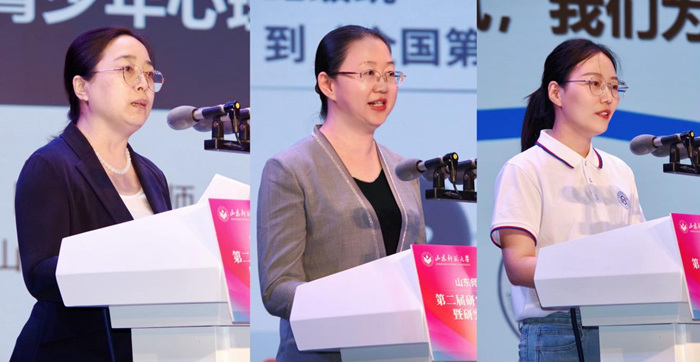 在交流发言阶段,“五导”卓越导学团队导师代表、心理学院党委书记赵景欣,研创赛年度重要贡献单位代表、信息科学与工程学院党委副书记、纪委书记刘一颍,校长奖获奖代表、化学化工与材料科学学院博士研究生赵宁宁分别进行交流分享。