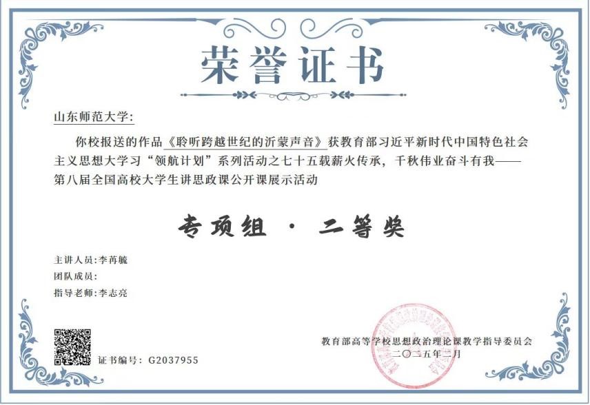 近日,教育部主办的第八届全国高校大学生讲思政课公开课展示活动获奖名单公布。我校马克思主义学部24级硕士研究生李苒毓的作品《聆听跨越世纪的沂蒙声音》经过激烈角逐,获全国专项组二等奖。