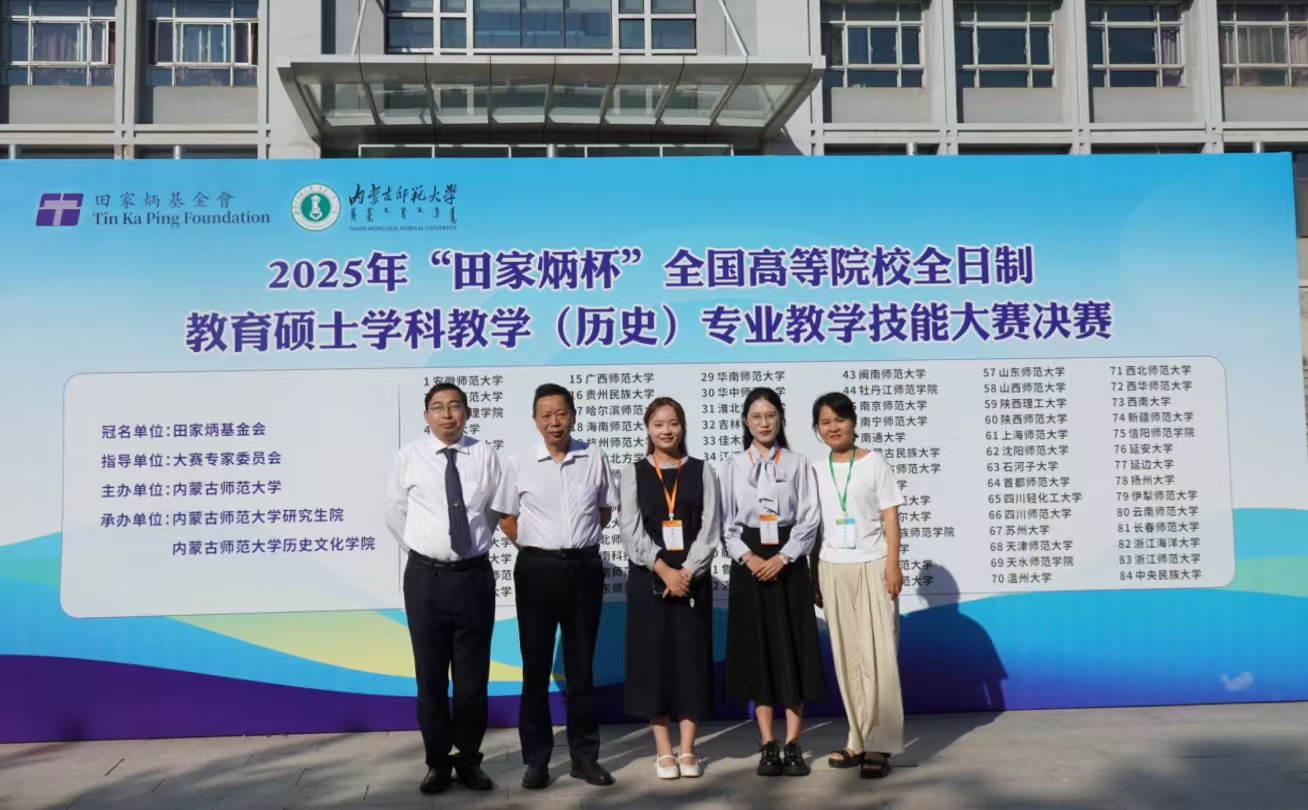 8月22日至25日,由田家炳基金会主办、内蒙古师范大学承办的2025年全国“田家炳杯”全日制教育硕士专业学位研究生学科教学(历史)专业教学技能大赛在“云中青城”呼和浩特举行,来自全国84所院校的163名参赛选手齐聚一堂,我院竞赛队伍由楼建军领队参赛,共赴盛会。24级硕士研究生曹燕群、王雨晴在指导教师楼建军、燕慧及校外导师赵然带领下参赛。经过激烈角逐,曹燕群获大赛一等奖,王雨晴获三等奖,楼建军教授获“优秀指导教师奖”,两位选手的教学设计同时荣获“优秀教学设计奖”。